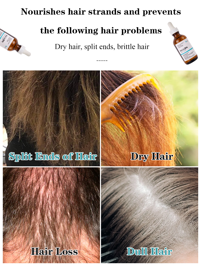 Deep nourishment: FATAZAEN hair essential oil is rich in a variety of natural plant essences, which can penetrate deep into the hair roots and hair follicles and provide sufficient nutrition to the hair. This deep nourishment not only improves hair quality, making it softer and smoother, but also enhances hair elasticity and toughness, reducing hair breakage and hair loss.