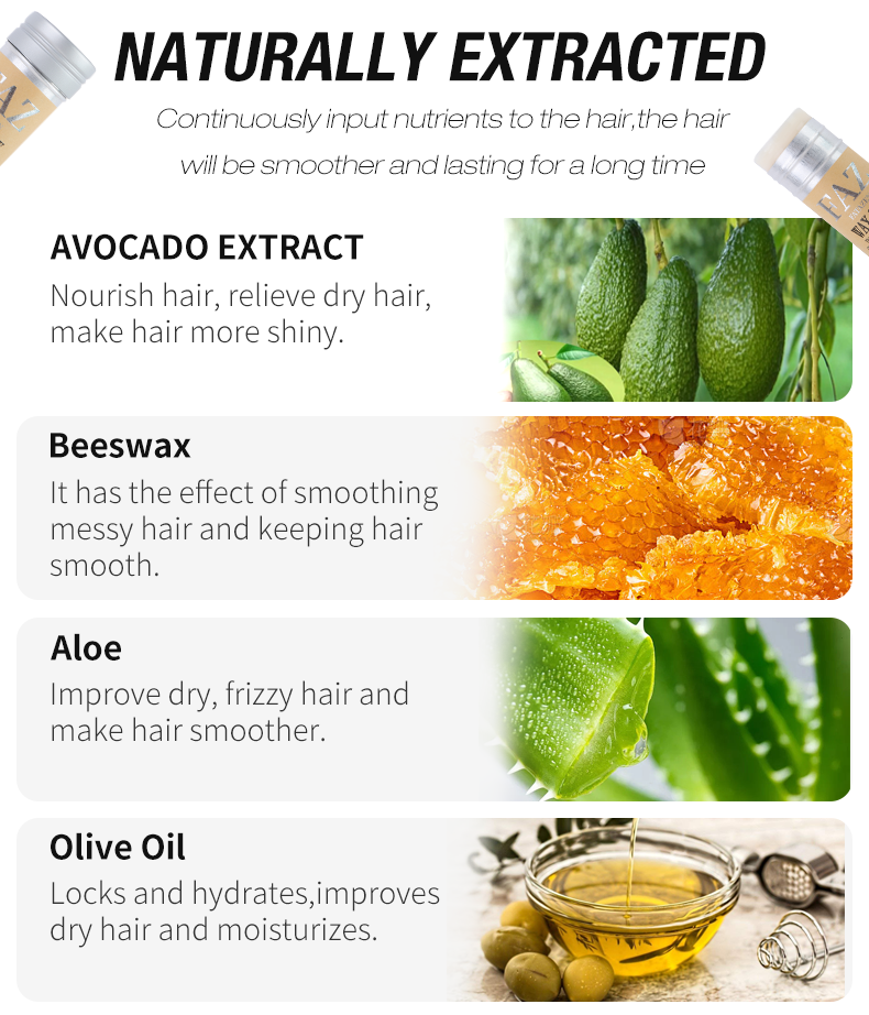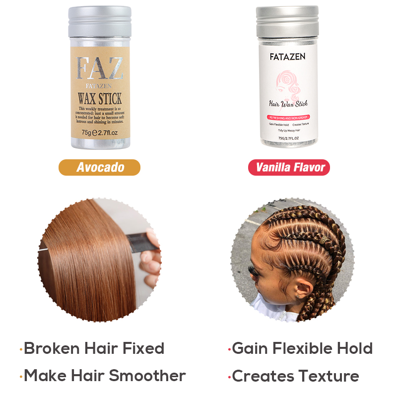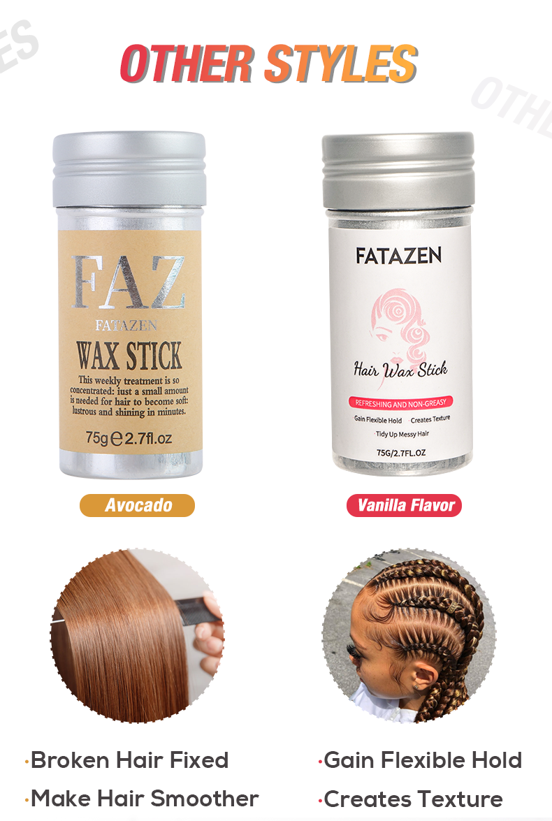 Fine texture and easy to mold: FATAZEN hair wax stick is designed with a unique texture, which is fine and easy to apply. It can easily create various hairstyles, whether it is smooth straight hair, fluffy curls or fashionable short hair. At the same time, the texture of the hair wax stick will not make the hair feel stiff or sticky, making the style more natural and smooth.