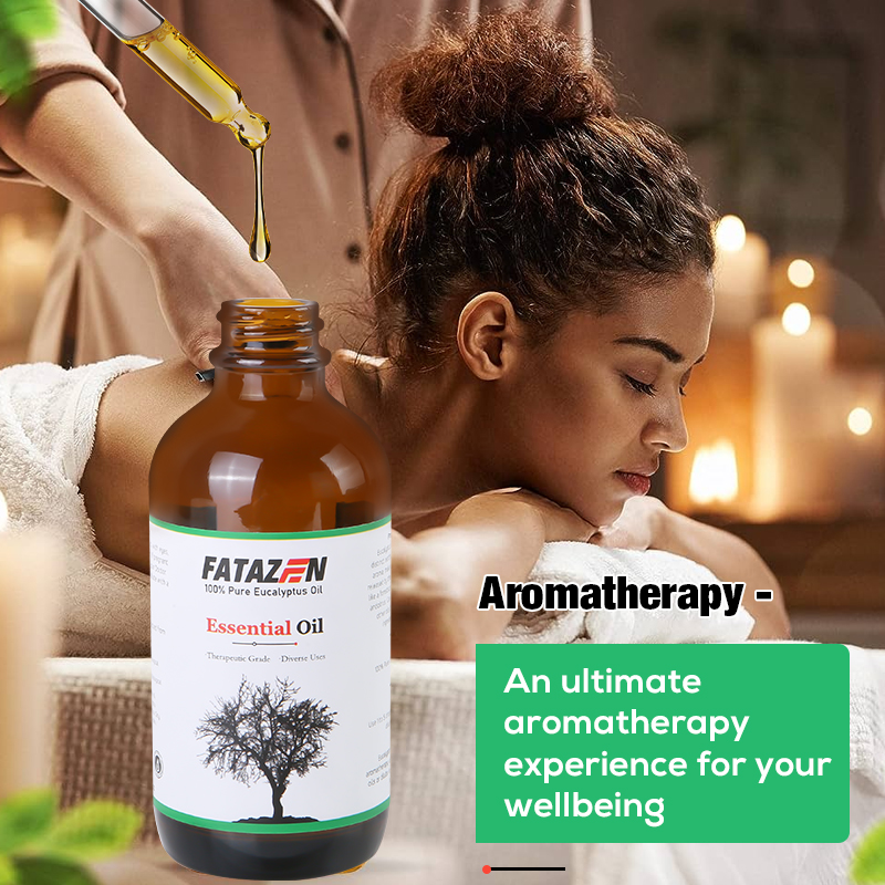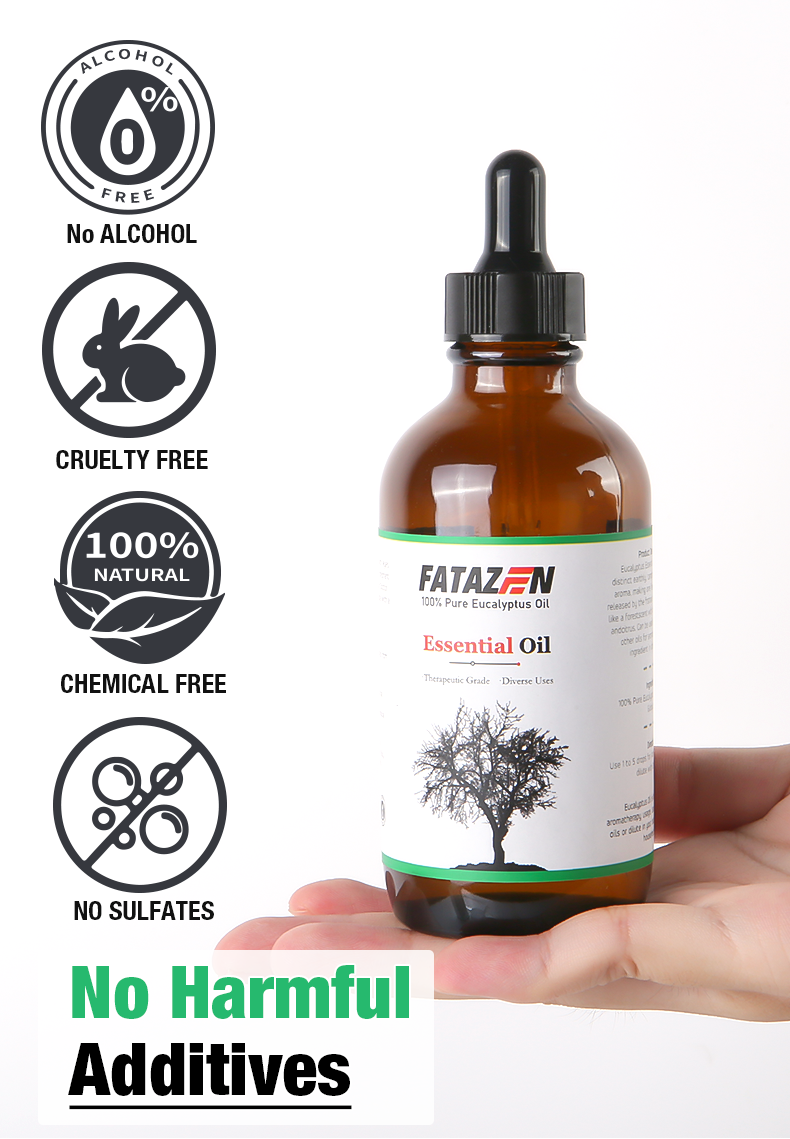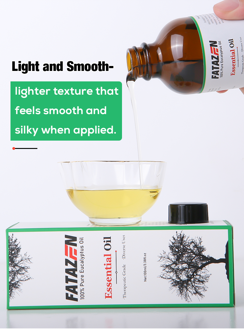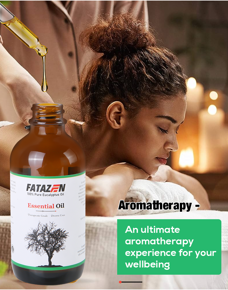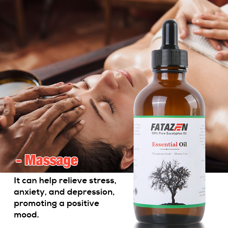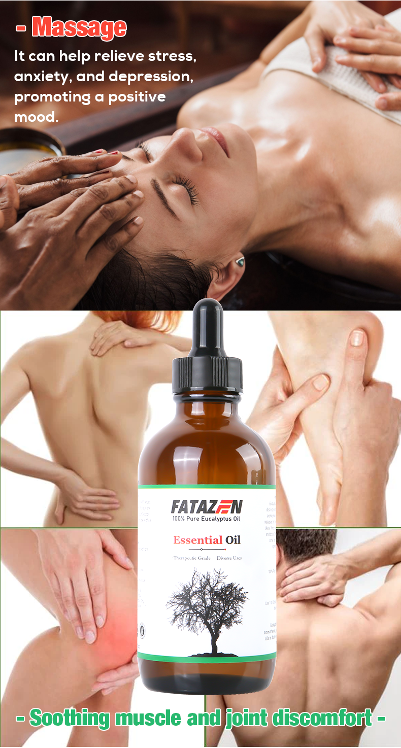Pleasant smell, relieves stress: Eucalyptus essential oil has a unique and pleasant aroma that can soothe tension and reduce stress. When using FATAZEN eucalyptus massage essential oil for massage, its aroma can penetrate the skin and enter the body, bringing physical and mental relaxation and pleasure, helping to improve sleep quality and enhance the overall mental state.