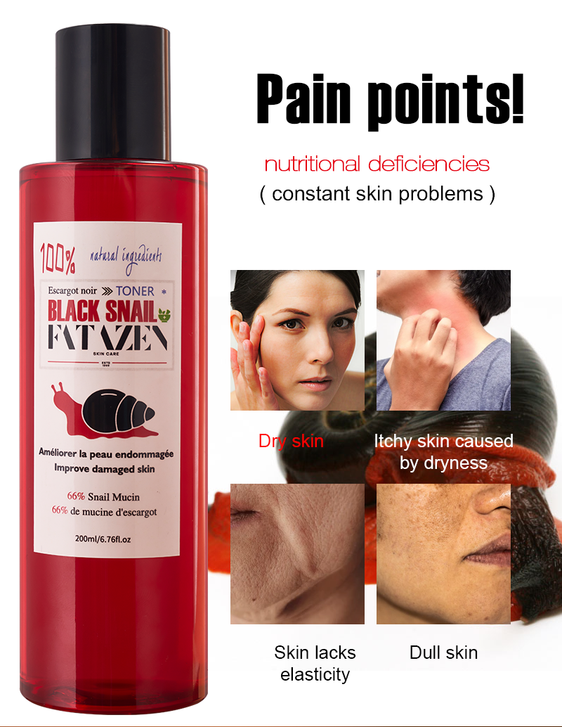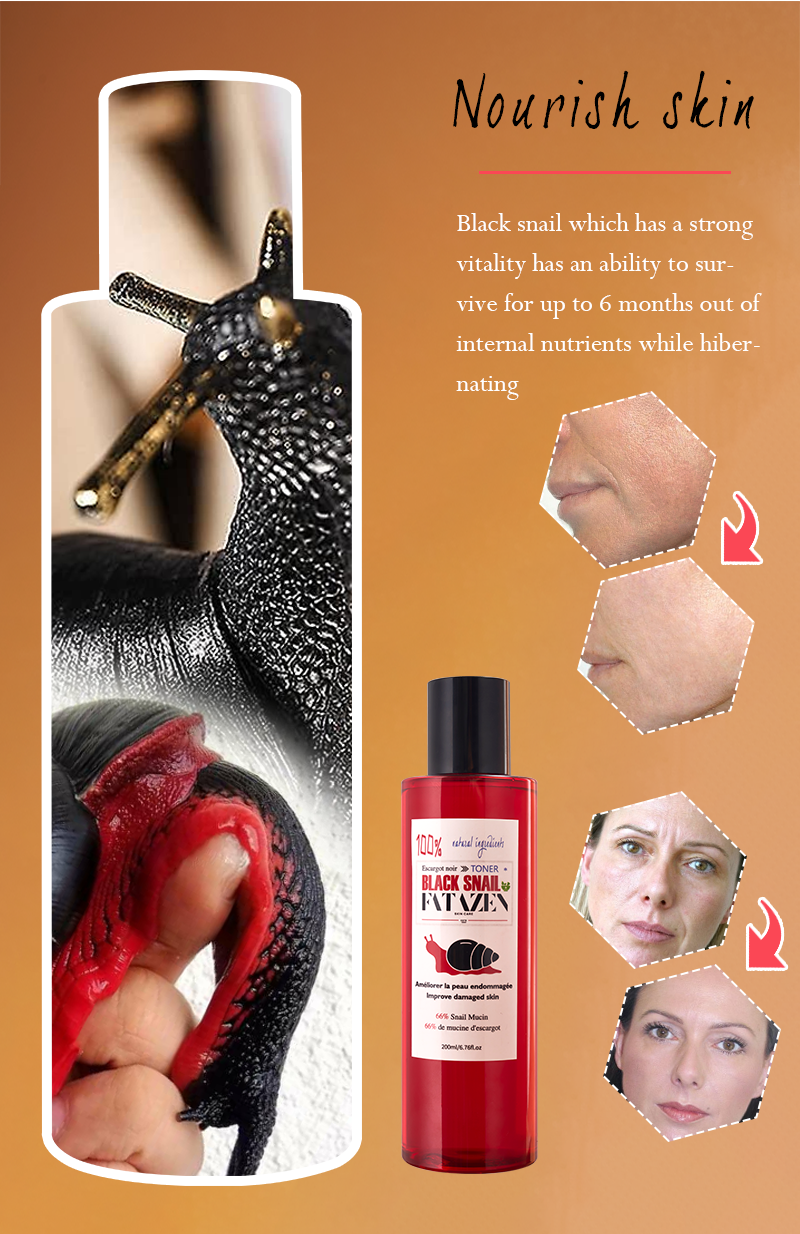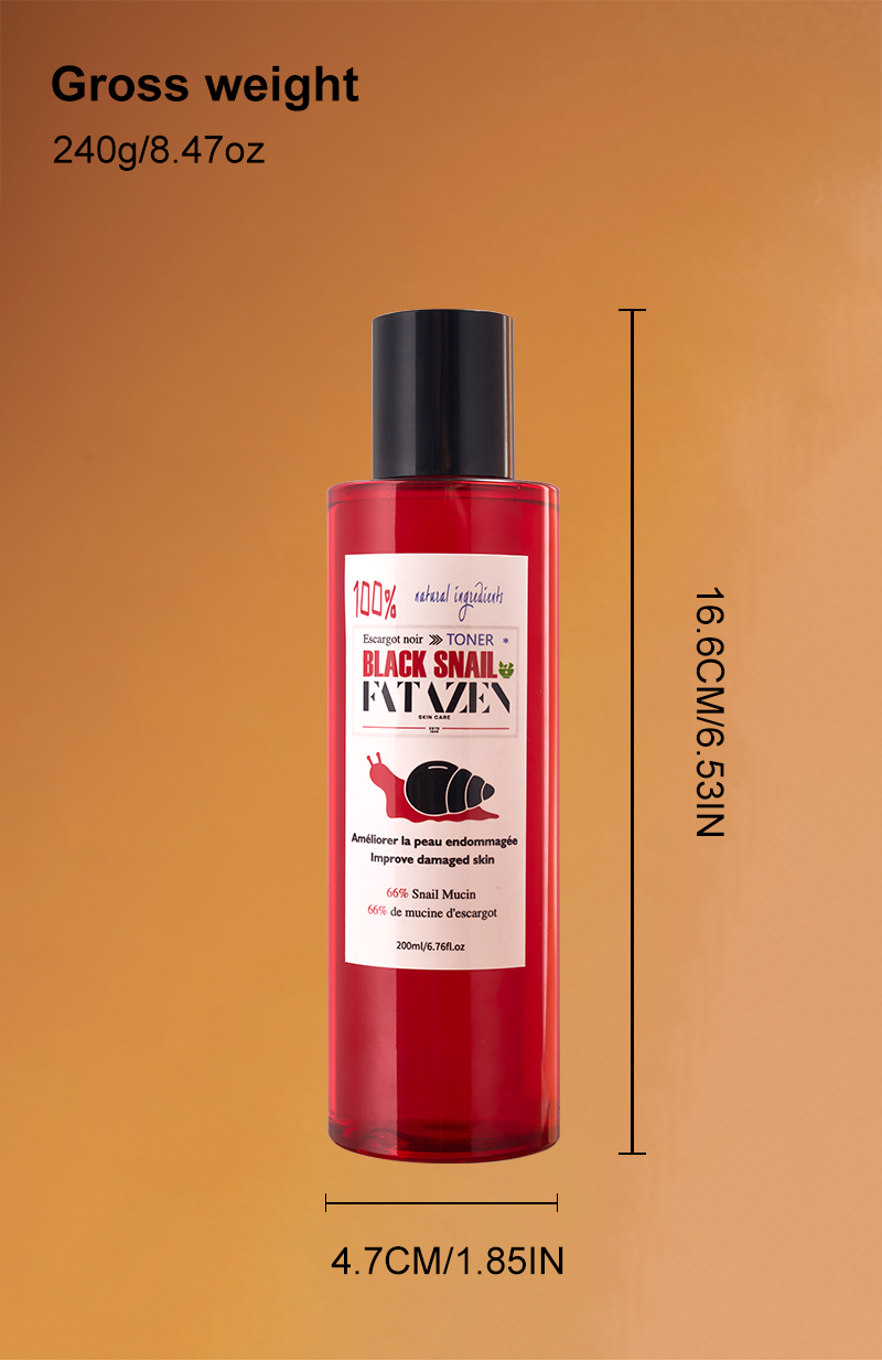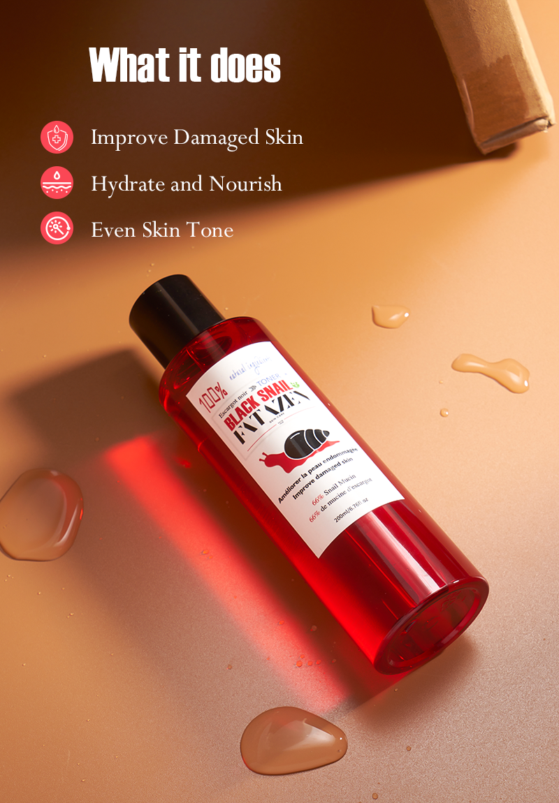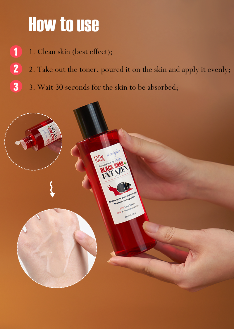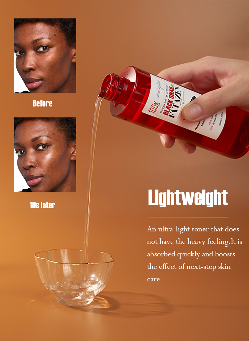 Deep nourishing and moisturizing: Black snail extract is rich in nourishing ingredients and can provide deep nourishing and moisturizing to the skin. This toner can quickly penetrate deep into the skin, replenishing the skin with moisture and nutrients, making the skin soft, smooth and elastic.