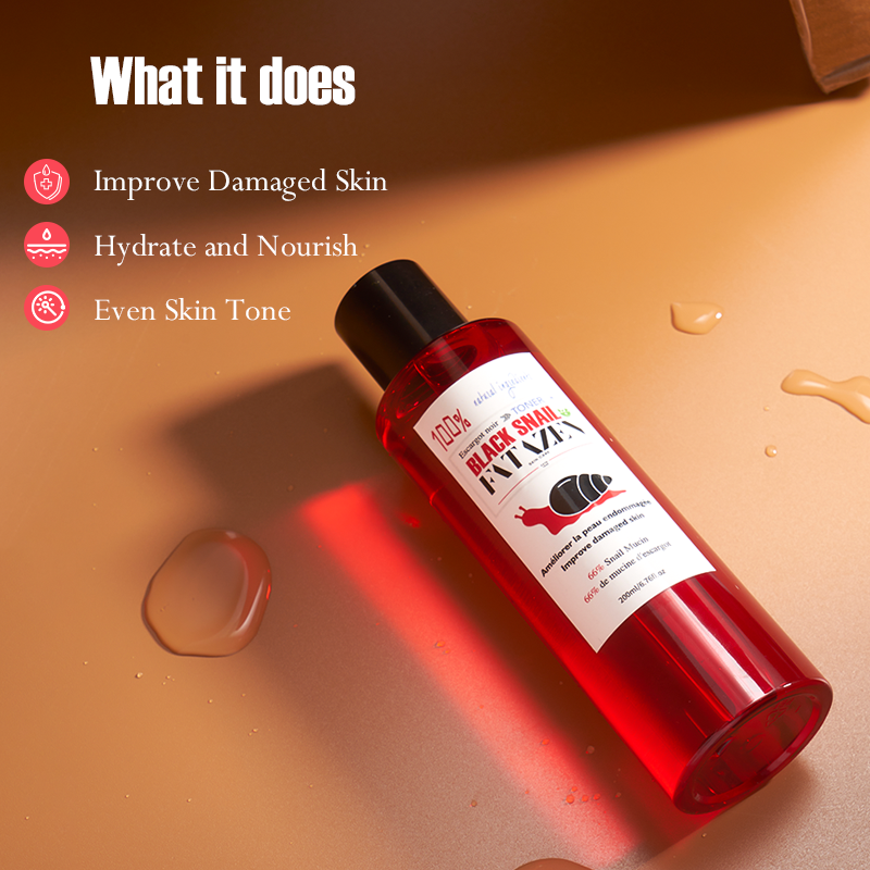 Deep nourishing and moisturizing: Black snail extract is rich in nourishing ingredients and can provide deep nourishing and moisturizing to the skin. This toner can quickly penetrate deep into the skin, replenishing the skin with moisture and nutrients, making the skin soft, smooth and elastic.