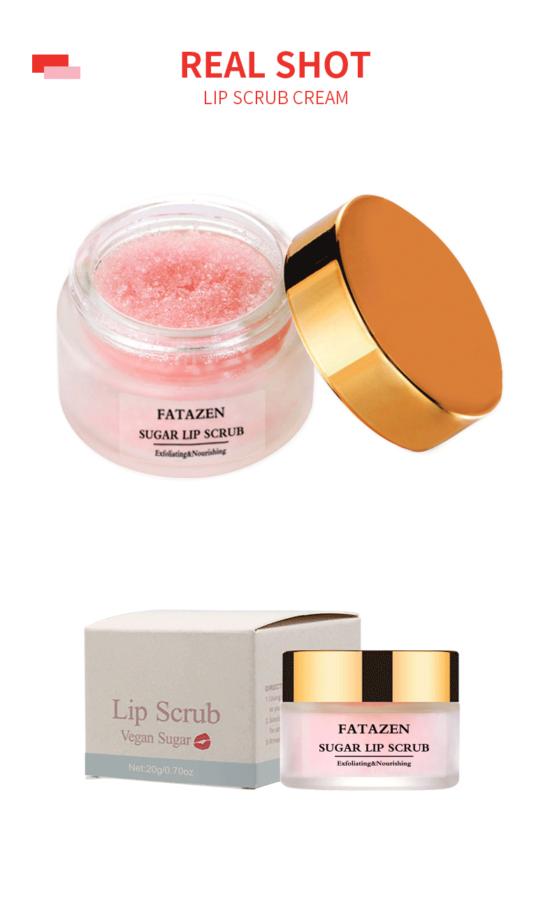 Soothing and repairing: FATAZEN lip scrub may also contain soothing ingredients, such as herbal extracts or vitamin E. These ingredients can relieve the discomfort of lip skin, such as dryness, tightness or pain, while repairing damaged lip tissue and promoting the regeneration and repair of lip skin.